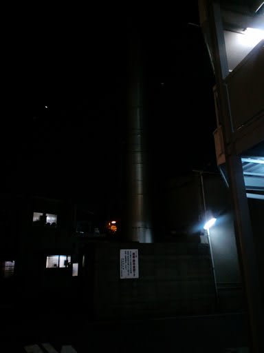 このあたりかと見当をつけて横道を入ると、うぉ〜っ!マンションの目の前に煙突がそびえ立つ!!