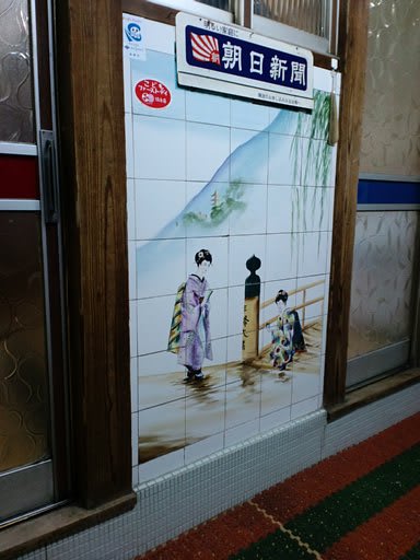 暖簾をくぐるとタイル絵と傘立てがお出迎え。
